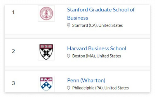 1위는 스탠포드 경영대학원, 2위는 하버드 경영대학원, 3위는 펜실베니아 대학교의 와튼스쿨이 차지하였는데, 이들은 모두 미국의 대학교들이며 미국 대학의 MBA가 세계적으로 우수함을 입증하고 있습니다.