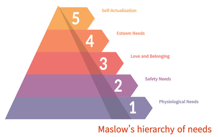 5단계의 욕구들은 피라미드처럼 계층적 순서로 배열되며, 매슬로우는 각 단계의 욕구가 충족되어야 다음 단계를 추구할 수 있다고 믿었습니다.